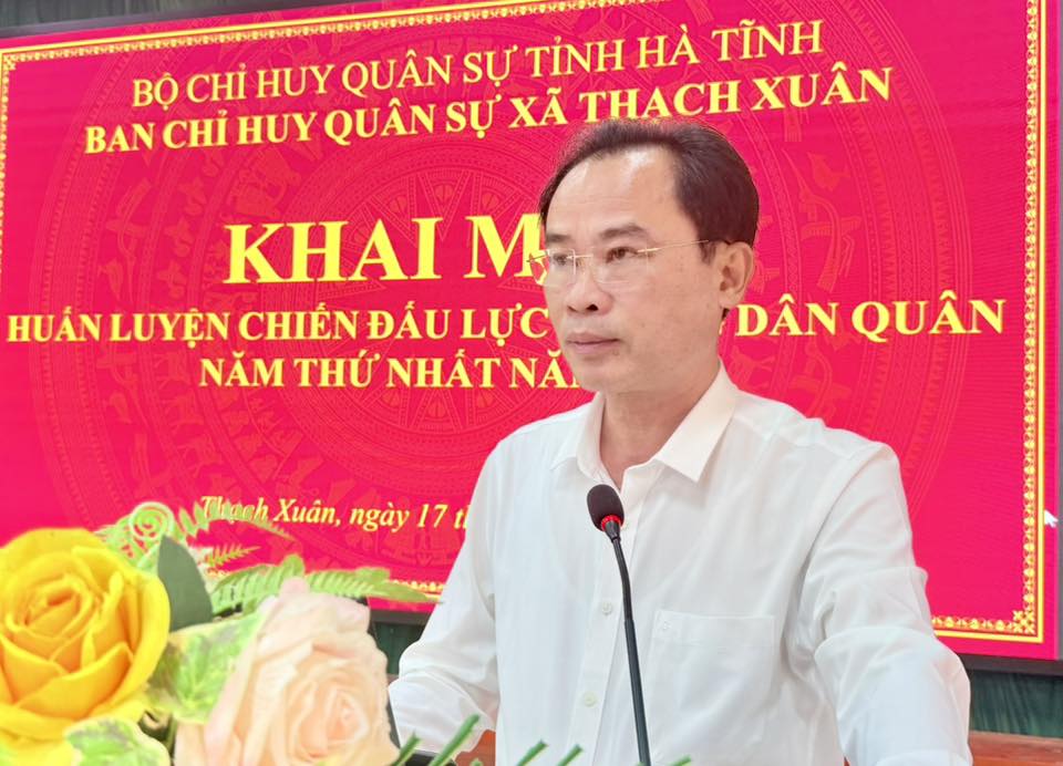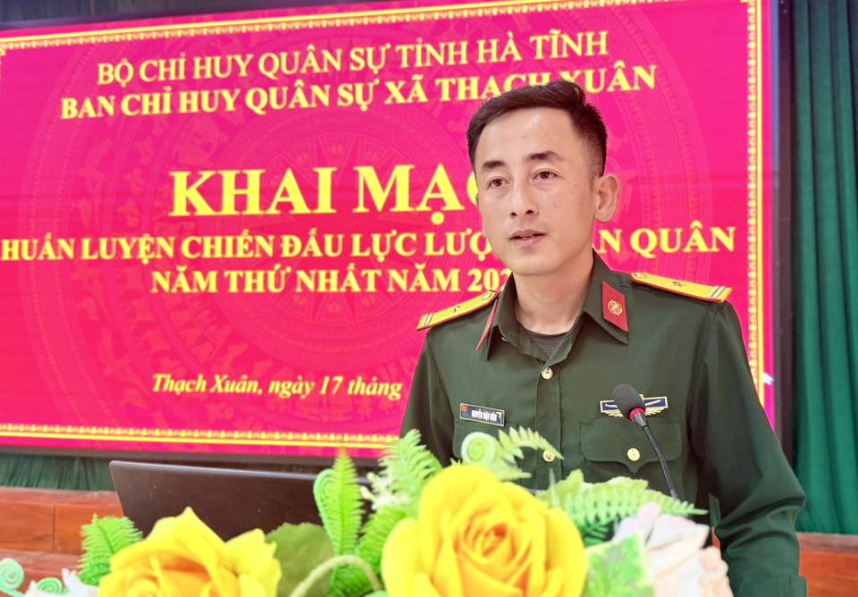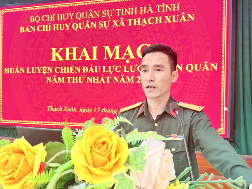 Phát biểu giao nhiệm vụ tại lớp huấn luyện, đồng chí Trần Quang Đông-Chủ tịch UBND xã yêu cầu Ban CHQS xã và toàn thể chiến sĩ dân quân quán triệt sâu sắc nhiệm vụ quân sự – quốc phòng năm 2026; nâng cao nhận thức, trách nhiệm của mỗi cán bộ, chiến sĩ; phát huy truyền thống của quê hương, nêu cao tinh thần cảnh giác cách mạng, chủ động nắm chắc tình hình, kịp thời phát hiện và đấu tranh làm thất bại mọi âm mưu, thủ đoạn của các thế lực thù địch. Tiếp tục củng cố, xây dựng lực lượng dân quân vững mạnh về chính trị, tư tưởng và tổ chức; phối hợp chặt chẽ với các lực lượng giữ vững ổn định chính trị, trật tự an toàn xã hội trên địa bàn, góp phần tạo môi trường thuận lợi cho phát triển kinh tế – xã hội của địa phương. Đối với lực lượng dân quân năm thứ nhất tham gia huấn luyện trong thời gian 15 ngày, yêu cầu mỗi đồng chí phải nêu cao tinh thần trách nhiệm, chấp hành nghiêm kỷ luật, tích cực học tập, rèn luyện. Phấn đấu kết thúc khóa huấn luyện 100% đạt yêu cầu, trong đó có 75% khá, giỏi trở lên. Bên cạnh đó, gắn công tác huấn luyện với phong trào thi đua quyết thắng; xây dựng nhiều mô hình, điển hình tiên tiến; kịp thời biểu dương, khen thưởng các tập thể, cá nhân hoàn thành xuất sắc nhiệm vụ; đồng thời xử lý nghiêm các trường hợp vi phạm kỷ luật hoặc thiếu tinh thần trách nhiệm. Ban CHQS xã làm tốt công tác tham mưu cho cấp ủy, chính quyền địa phương trong tổ chức huấn luyện; bảo đảm đầy đủ chế độ, chính sách cho lực lượng dân quân theo quy định hiện hành; giao trách nhiệm cho đồng chí Chỉ huy trưởng và Phó Chỉ huy trưởng tổ chức điều hành huấn luyện chặt chẽ, nghiêm túc, bảo đảm an toàn tuyệt đối về người, vũ khí, trang bị và an toàn giao thông.