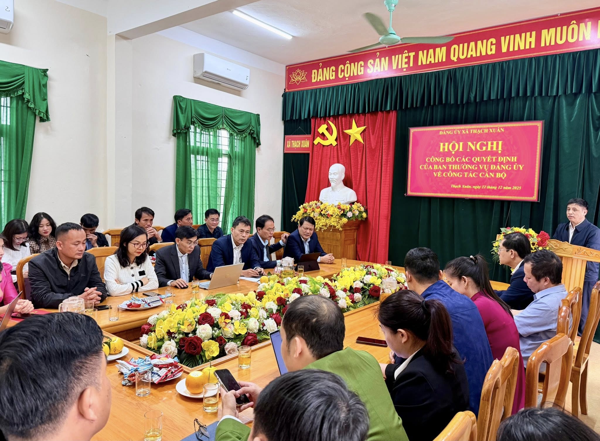 Hội nghị đã công bố các quyết định bổ nhiệm đối với ba cán bộ. Cụ thể: Bổ nhiệm đồng chí Trần Thị Hồng Nhung, hiện là Công chức Văn phòng Đảng ủy, giữ chức Phó Chánh Văn phòng Đảng ủy xã Thạch Xuân; Bổ nhiệm bà Trần Thị Hồng Thắm, công chức Văn phòng HĐND và UBND xã giữ chức vụ Phó Chánh Văn phòng HĐND và UBND xã Thạch Xuân kể từ ngày 19/12/2025; Bổ nhiệm ông Nguyễn Cẩm Lệ, công chức Phòng Văn hóa – Xã hội xã giữ chức Phó Trưởng phòng Văn hóa – Xã hội xã Thạch Xuân kể từ ngày 19/12/2025.