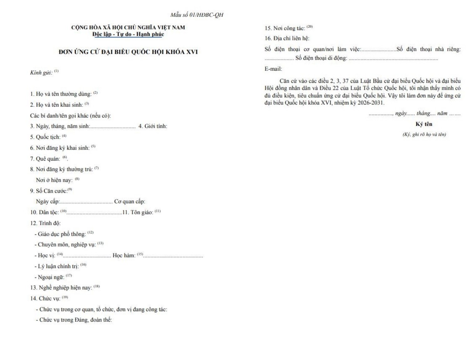 Mẫu đơn ứng cử ĐBQH khóa XVI theo Nghị quyết số 40/NQ-HĐBCQG ngày 29/9/2025 của Hội đồng bầu cử quốc gia.
