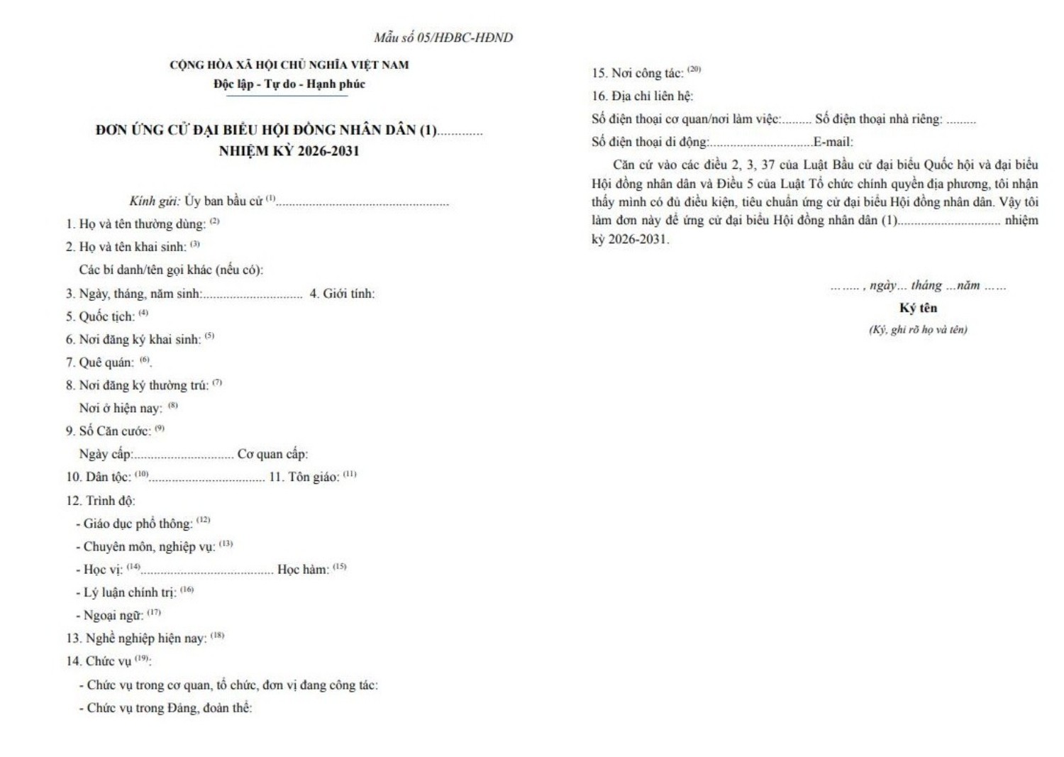 Mẫu đơn ứng cử đại biểu HĐND nhiệm kỳ 2026-2031 theo Nghị quyết số 40/NQ-HĐBCQG ngày 29/9/2025 của Hội đồng bầu cử quốc gia.