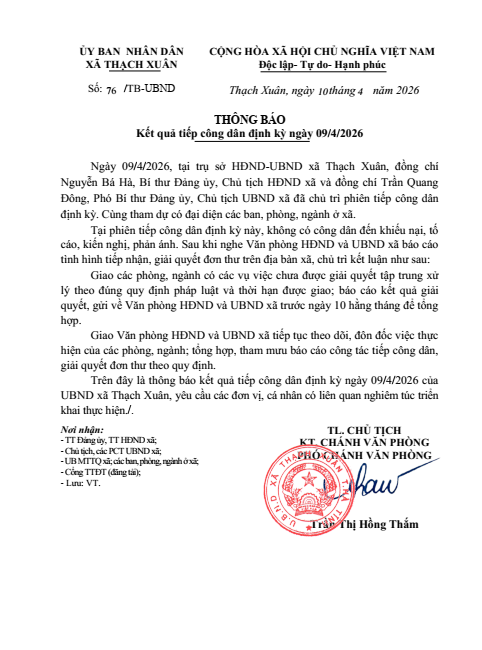 THÔNG BÁO Kết quả tiếp công dân định kỳ ngày 09/4/2026